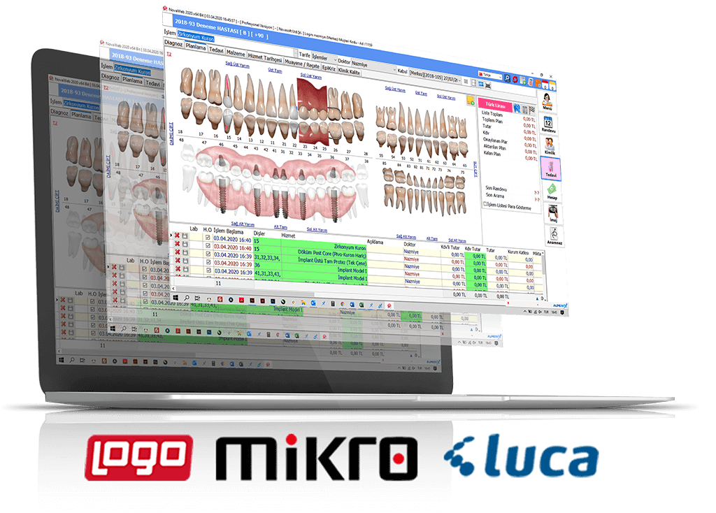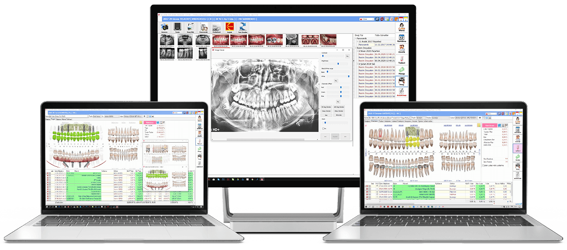Tedavi sekmesi ise, Hasta mevcut diyagnoz durumu ile gelir ve diş şeması üzerinde dilerseniz tek tek dilerseniz üst tam, Sağ üst yarım, Sol üst yarım, Alt tam, Sağ alt yarım, Sol alt yarım seçenekleriyle aynı anda birden fazla işlem yapmanıza olanak sağlayan bir alan bulunmaktadır yada hastayla karar verilen planlamayı otomatik olarak aktarabileceğiniz ve tedavi işlemlerini takip edebileceğiniz hangi doktorun hangi işlemleri yaptığını görebileceğiniz genel bir bölümdür. Aynı anda diyagnoz, planlama ve tedavi ekranlarını karşılaştırmalı olarak tek ekranda buradan görebilirsiniz.